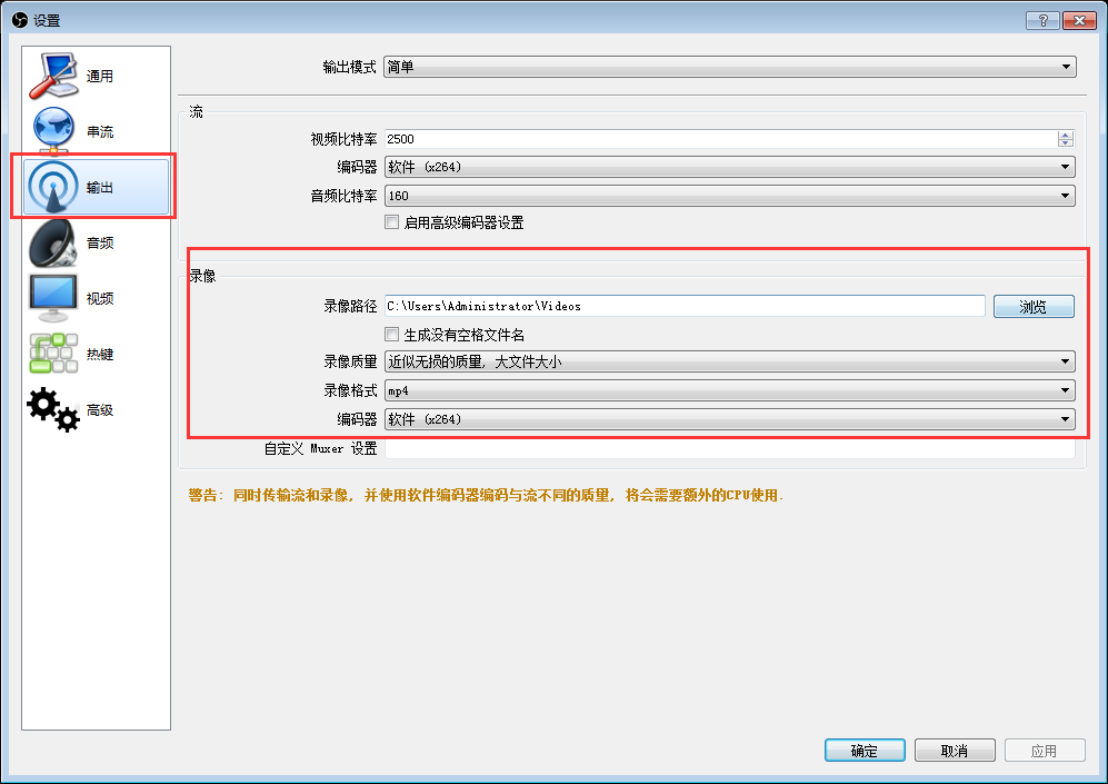 7. OBS Studio視頻錄制,點擊“設(shè)置”,在彈出的視窗中,點擊“輸出”,選擇錄像存儲的位置,錄像質(zhì)量,錄像保持的格式后,回主界面點擊開始錄制,進(jìn)行視頻錄制