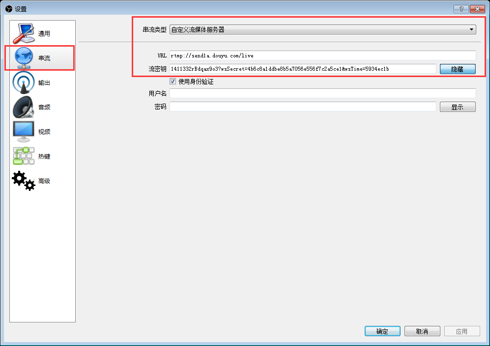 8. OBS Studio視頻直播,點擊“設(shè)置”,在彈出的視窗中,點擊“串流”,在“串流類型”旁下拉框里選擇“自定義流媒體服務(wù)器”,復(fù)制直播平臺的RTMP地址到“ULC”欄,復(fù)制直播平臺的直播碼到“流密鑰”欄,點擊“確定”保存,回到主界面點擊“開始串流”進(jìn)行視頻直播