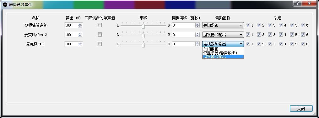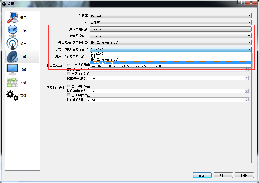 選擇音頻,將“麥克風(fēng)/輔助音頻設(shè)備”選擇采集卡設(shè)備,如果采集卡帶有MIC音頻輸入,在麥克風(fēng)/輔助音頻設(shè)備2選擇采集卡MIC設(shè)備(沒有MIC輸入接口請忽略此步),其他的選Disabled
