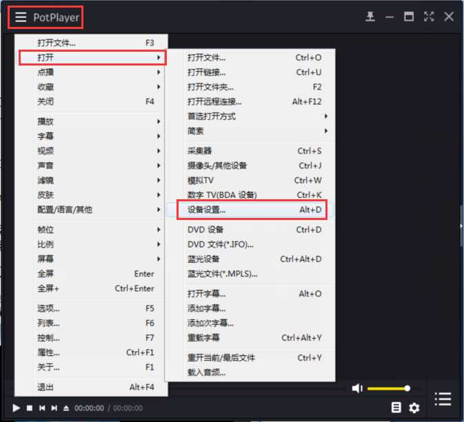 3. 雙擊打開PotPlayer軟件,點(diǎn)擊左上角“PotPlayer”圖標(biāo)彈出下拉欄窗口選擇“打開”,在彈出的窗口中點(diǎn)擊“設(shè)備設(shè)置”,也可直接使用快捷鍵Alt+D來打開“設(shè)備設(shè)置”。