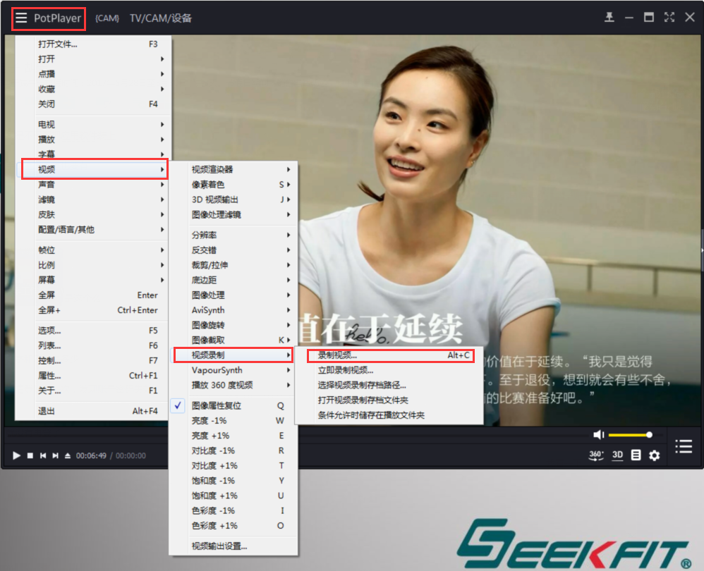 5. 點(diǎn)擊左上角“PotPlayer”圖標(biāo)彈出下拉欄窗口選擇“視頻”,在彈出的窗口中點(diǎn)擊“視頻錄制”,在彈出的窗口中點(diǎn)擊“錄制視頻”,也可直接使用快捷鍵Alt+C來打開“錄制視頻”