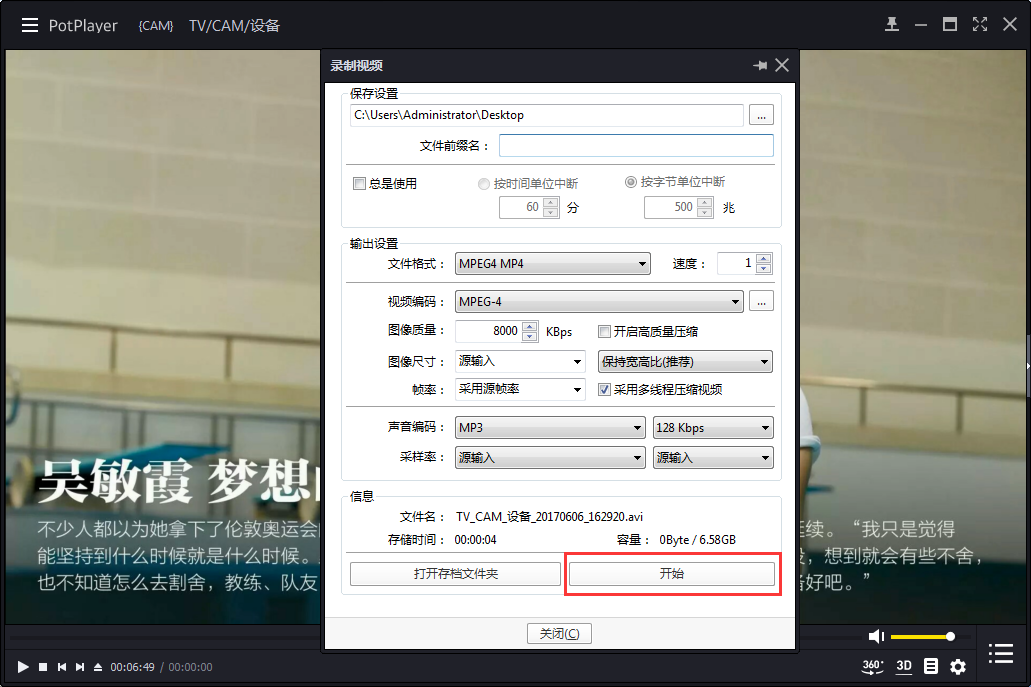 6. 設(shè)置視頻保持的位置,文件名,視頻錄制保持的格式,視頻編碼的方式,圖像的質(zhì)量,分辨率,幀率,聲音編碼采樣率等,設(shè)置完成后點(diǎn)擊“開始”,開始視頻錄制