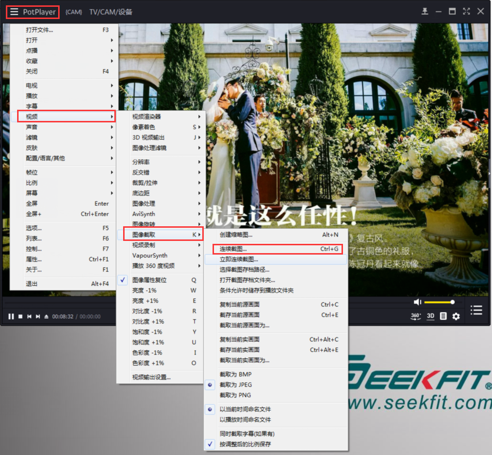 7. 點(diǎn)擊左上角“PotPlayer”圖標(biāo)彈出下拉欄窗口選擇“視頻”,在彈出的窗口中點(diǎn)擊“圖像截取”,在彈出的窗口中點(diǎn)擊“連續(xù)截取”,也可直接使用快捷鍵Ctrl+G來打開“連續(xù)截圖”