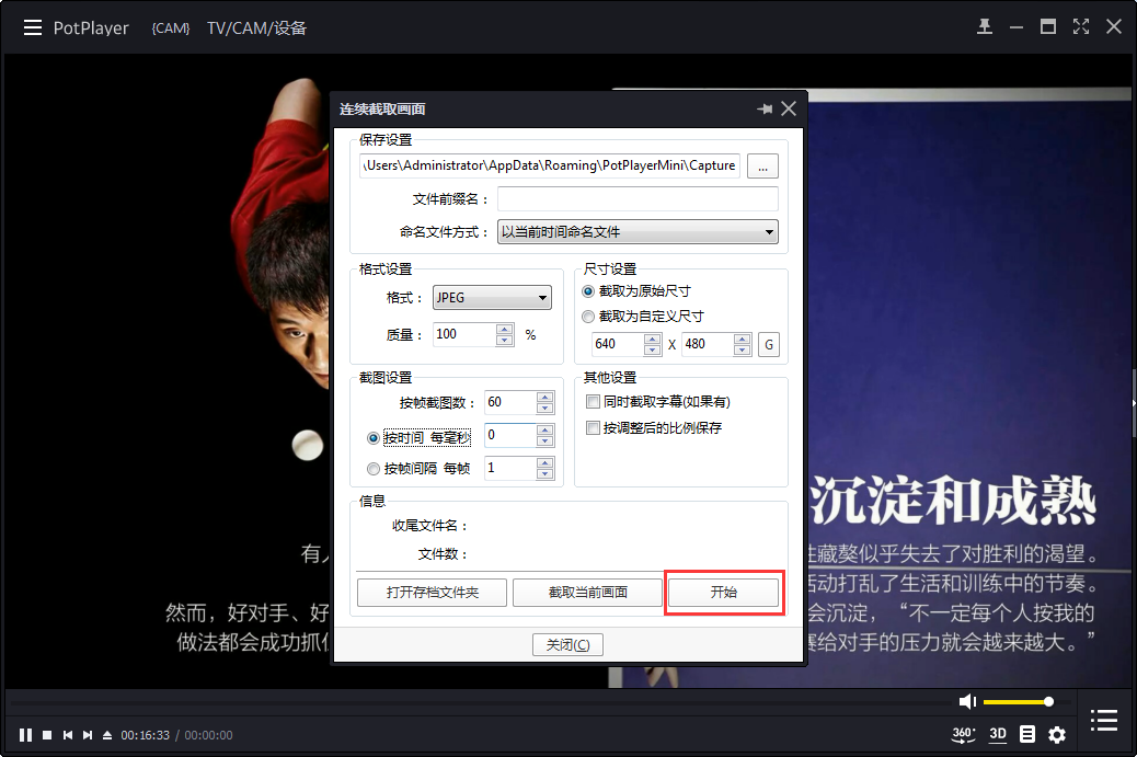 8. 設(shè)置截取畫面保存的位置,文件名,圖片的格式,圖片的質(zhì)量,圖片的尺寸,截取的張數(shù),截取的頻率等,設(shè)置完成后點(diǎn)擊“開始”,開始截取畫面