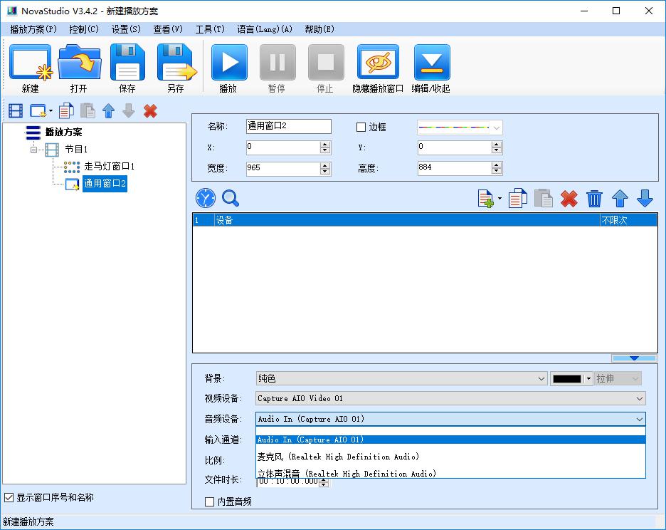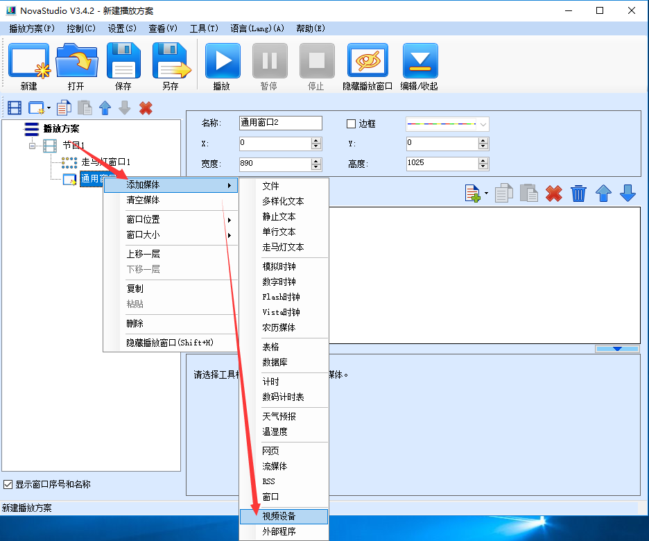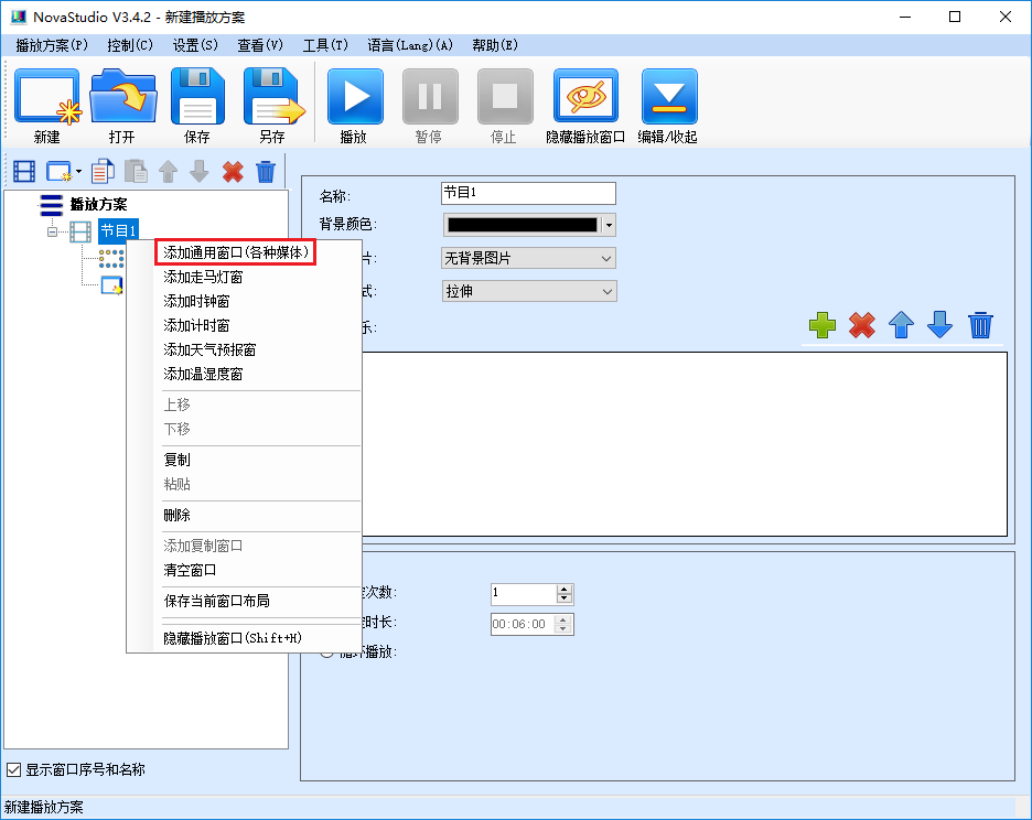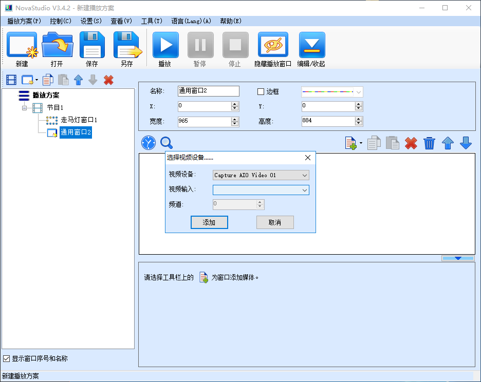3. 采集卡安裝好接上信號源并啟動NovaStudio,新建節(jié)目,在節(jié)目里添加通用窗口