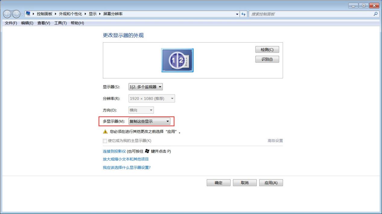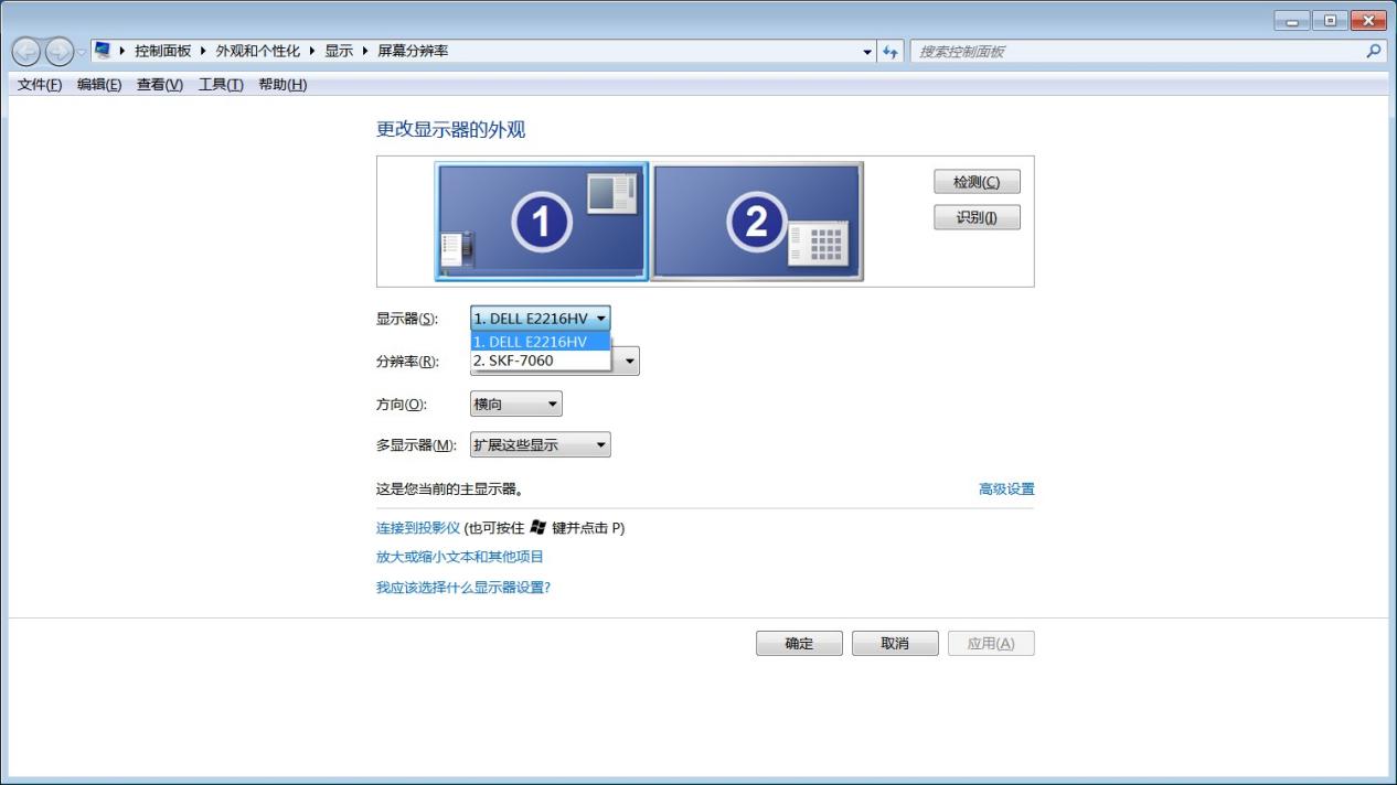 3. 裝好采集卡后用HDMI線連接采集卡和B電腦顯卡,進(jìn)入分辨率設(shè)置,會(huì)檢測(cè)到有兩個(gè)顯示器,1是B電腦顯示器,2是SKF-7060(思非Capture Mini采集卡對(duì)應(yīng)的顯示名稱(chēng));