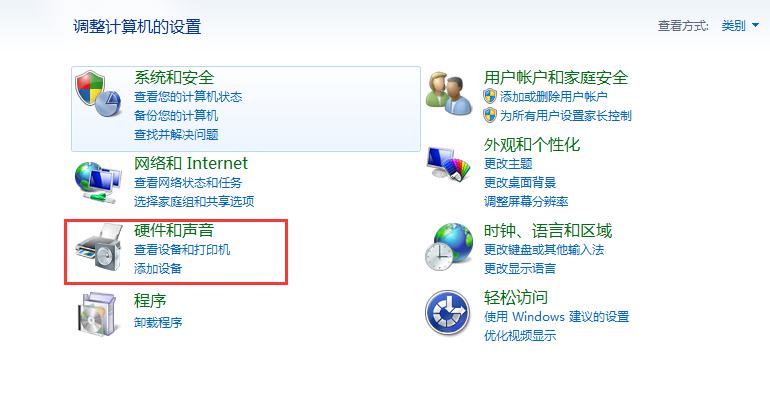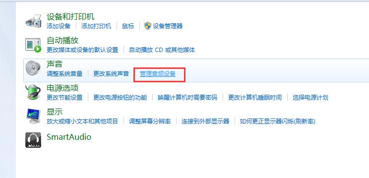 4. 采集聲音按下圖設(shè)置,先打開(kāi)控制面板,點(diǎn)擊硬件和聲音,然后點(diǎn)擊管理音頻設(shè)備;
