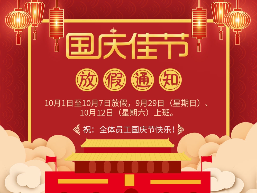 國(guó)慶節(jié)放假時(shí)間為: 10月1日—10月7日,9月28日(周六)放假一天,9月29日(周日)上班,10月12日上班。在國(guó)慶長(zhǎng)假來(lái)臨之際,預(yù)祝大家國(guó)慶假期愉快和諧、幸福安康!